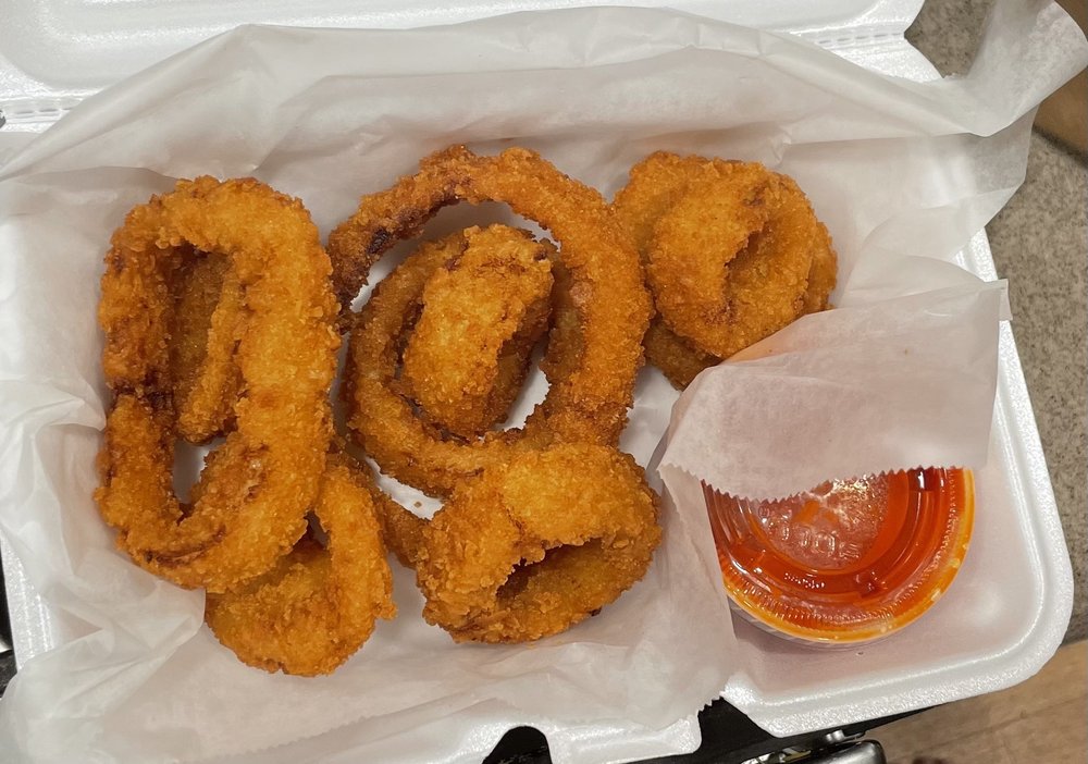 Fried onions, cheddar cheese, green peppers and mushrooms.